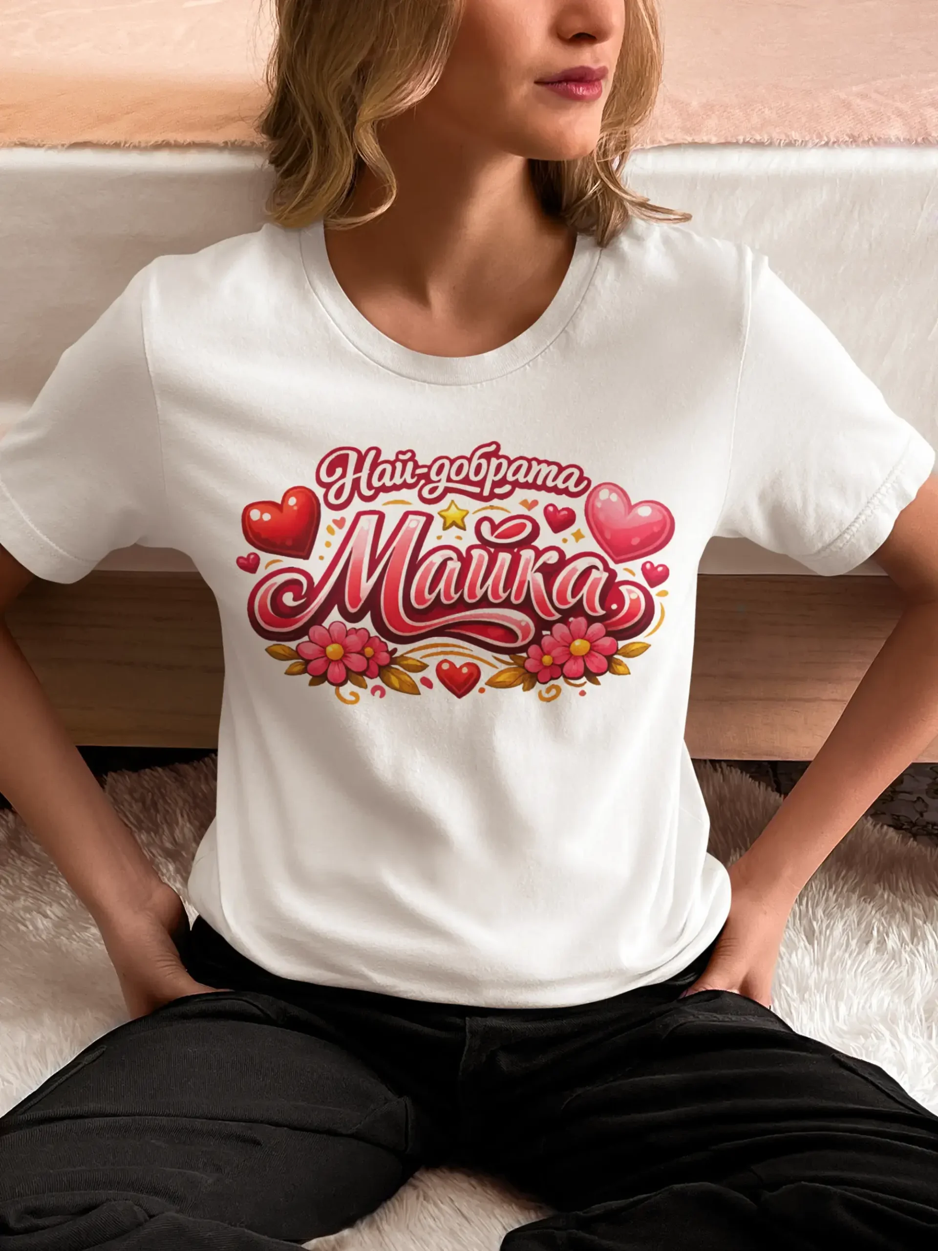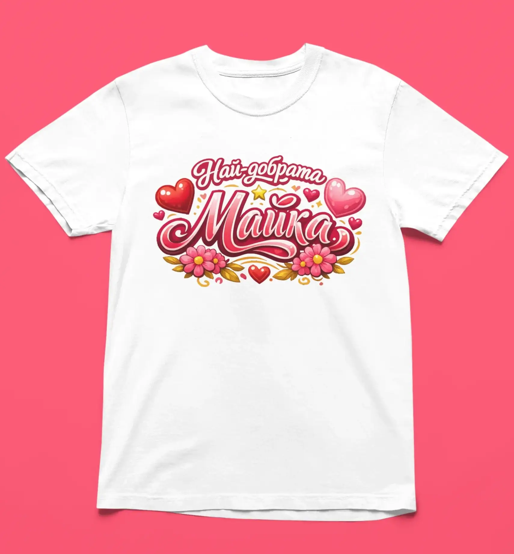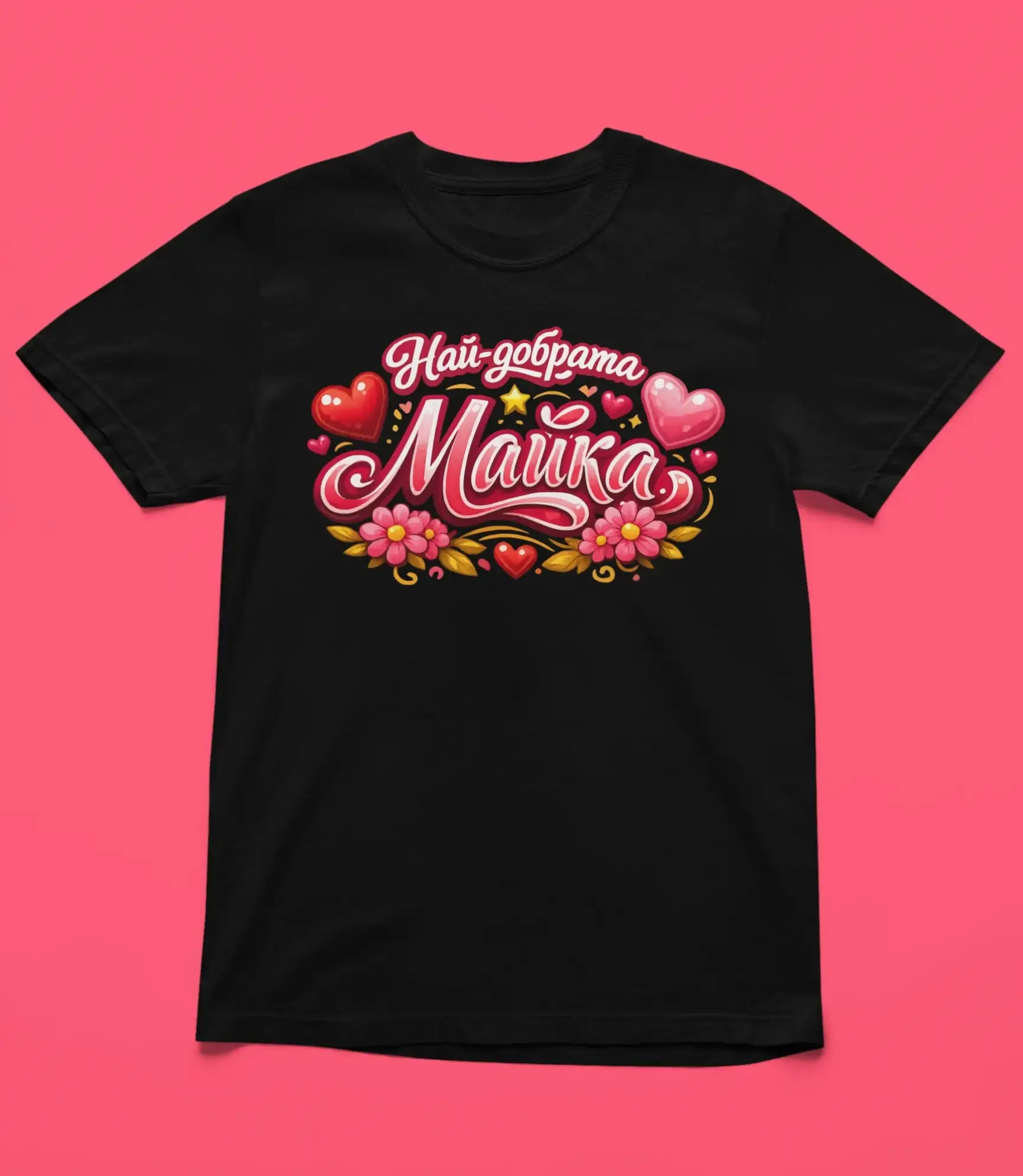Печатът е реализиран с модерна DTF технология, която гарантира ярки цветове, висока детайлност и изключителна издръжливост. Дизайнът с надпис „Най-добрата Майка“ е изпълнен с любовни символи, сърца и цветя, което превръща тениската в истински емоционален подарък. Печатът не се напуква, не избледнява и не се лющи с времето.