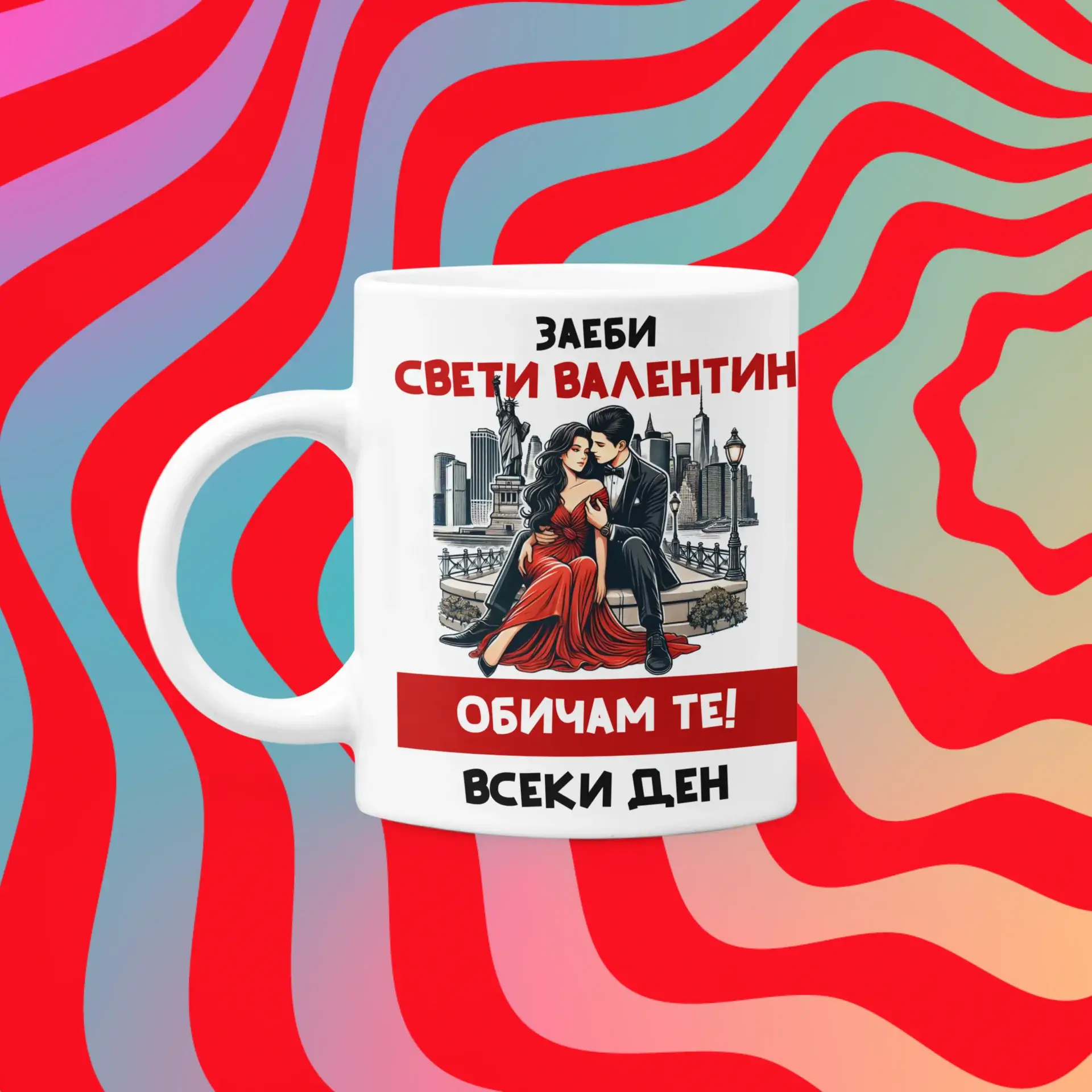Дизайнът на чашата е това, което я прави наистина специална. На нея е изобразена романтична сцена на двойка в градска атмосфера, придружена от изразителен и закачлив текст: „Забеи Свети Валентин. Обичам те всеки ден“. Това подчертава, че любовта не се ограничава само до един ден в годината, а трябва да се празнува ежедневно. Ярките и наситени цветове в дизайна добавят допълнителна нотка на изисканост и стил.