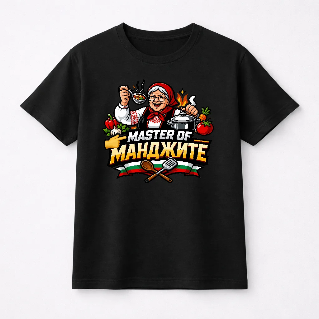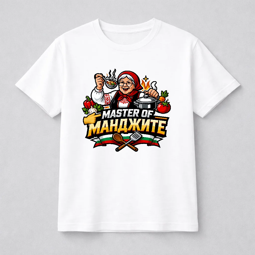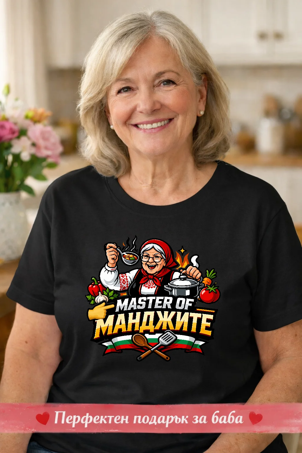 Тениска за баба Master of Манджите е перфектният избор за всяка готвеща баба, която обича да радва семейството си с вкусни ястия. Дизайнът включва усмихната баба в традиционно облекло, държаща черпак и тенджера, заобиколена от зеленчуци и кухненски прибори. Надписът „Master of Манджите“ ясно показва, че тази тениска е за истинските майсторки в кухнята.