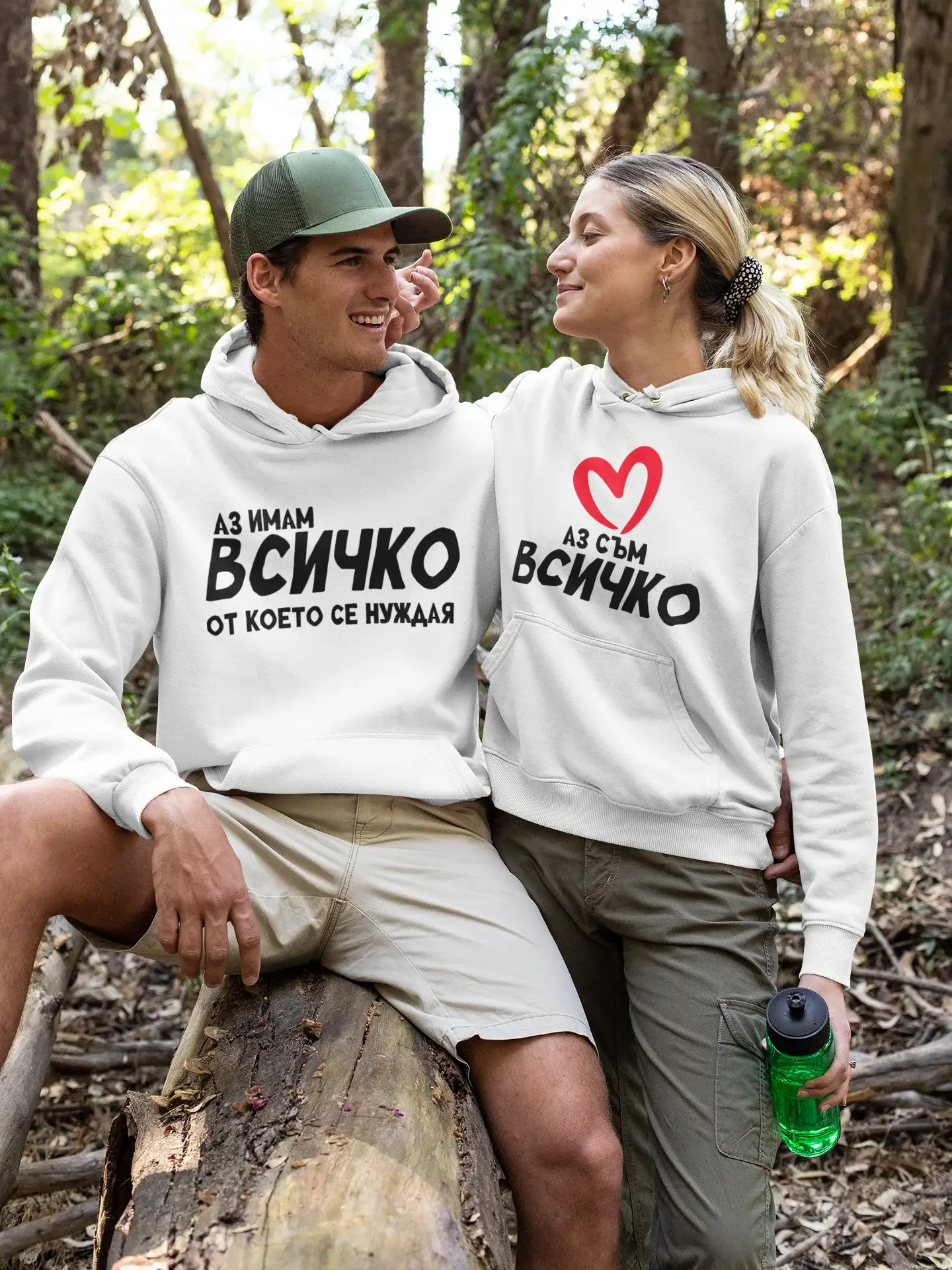 Създаването на специална връзка между двама влюбени често се състои от малки жестове, които придават допълнителен блясък на ежедневието. Един такъв жест са суичърите за двойки, които не просто показват, че двамата си принадлежите, но и предават послание, изпълнено с романтика и топлина. Нашите суичъри за влюбени с надписи „Аз имам всичко от което се нуждая“ и „Аз съм всичко“ са идеалният начин да подчертаете своята любов и връзка, съчетавайки удобство, стил и качество.