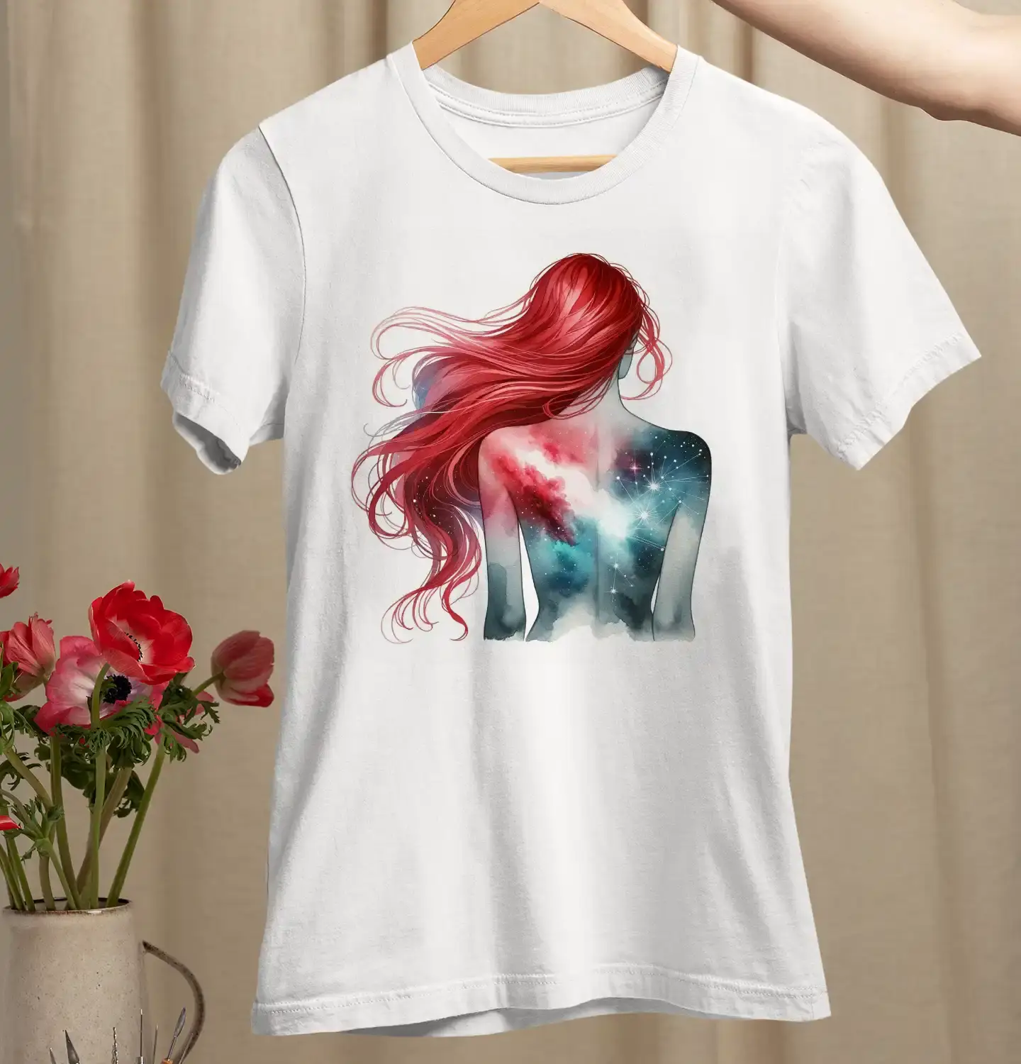 Станете част от магията на вселената с дамската тениска „Аркана 13“. Тази хубава дамска тениска с къс ръкав представя зашеметяващ дизайн – женски силует с дълга, развята червена коса, която се слива с космическите галактики. Щампата излъчва сила, свобода и връзка с безкрайността на вселената, като същевременно подчертава индивидуалността и женската енергия.