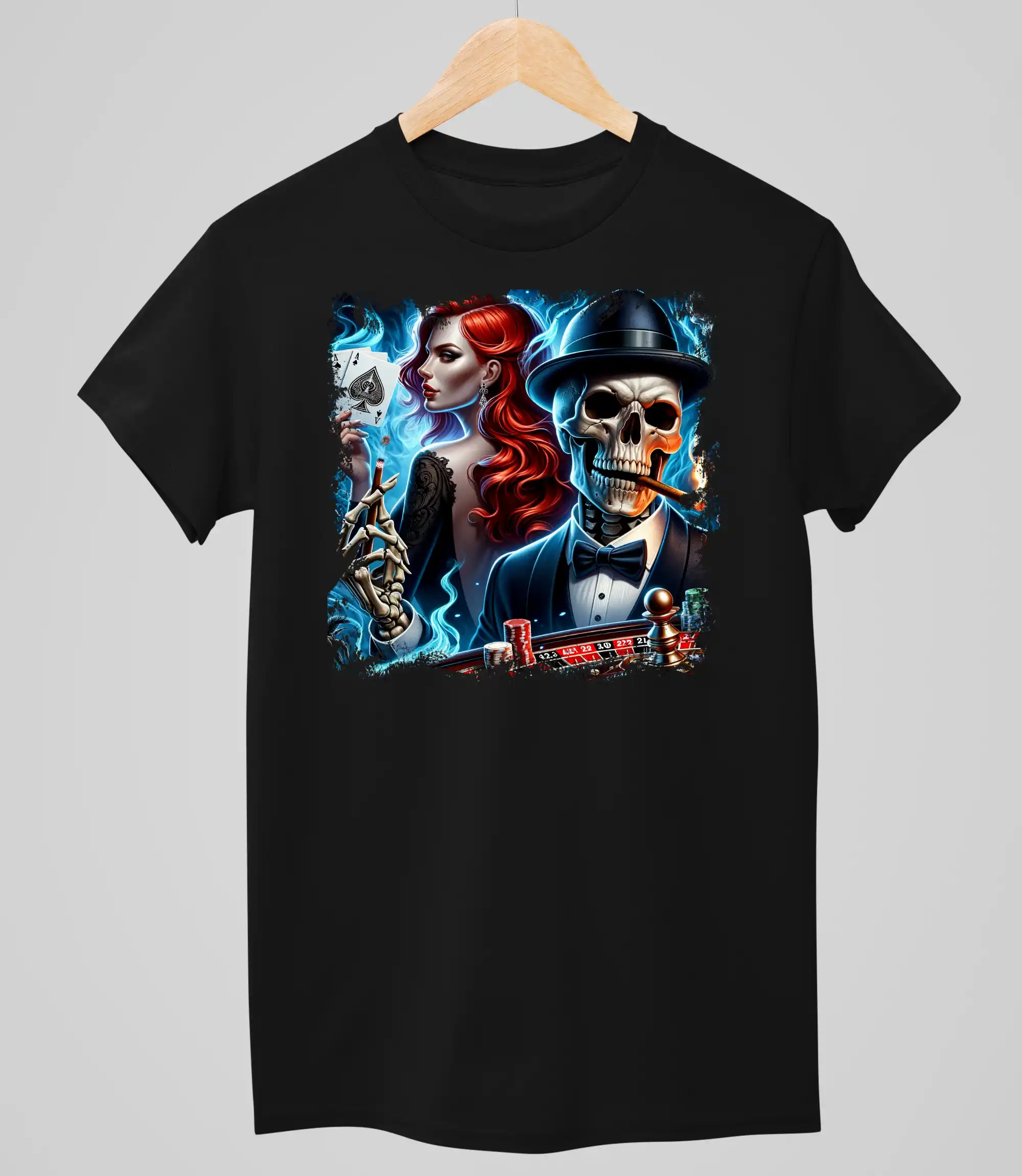 Открийте уникалния стил и комфорт с нашата тениска карти и черепи 27, проектирана да добави елегантност и индивидуалност към вашия ежедневен гардероб. Създадена от 100% висококачествен памук, тази тениска обещава несравним комфорт и мекота, които ще оцените от първия момент, в който я облечете.