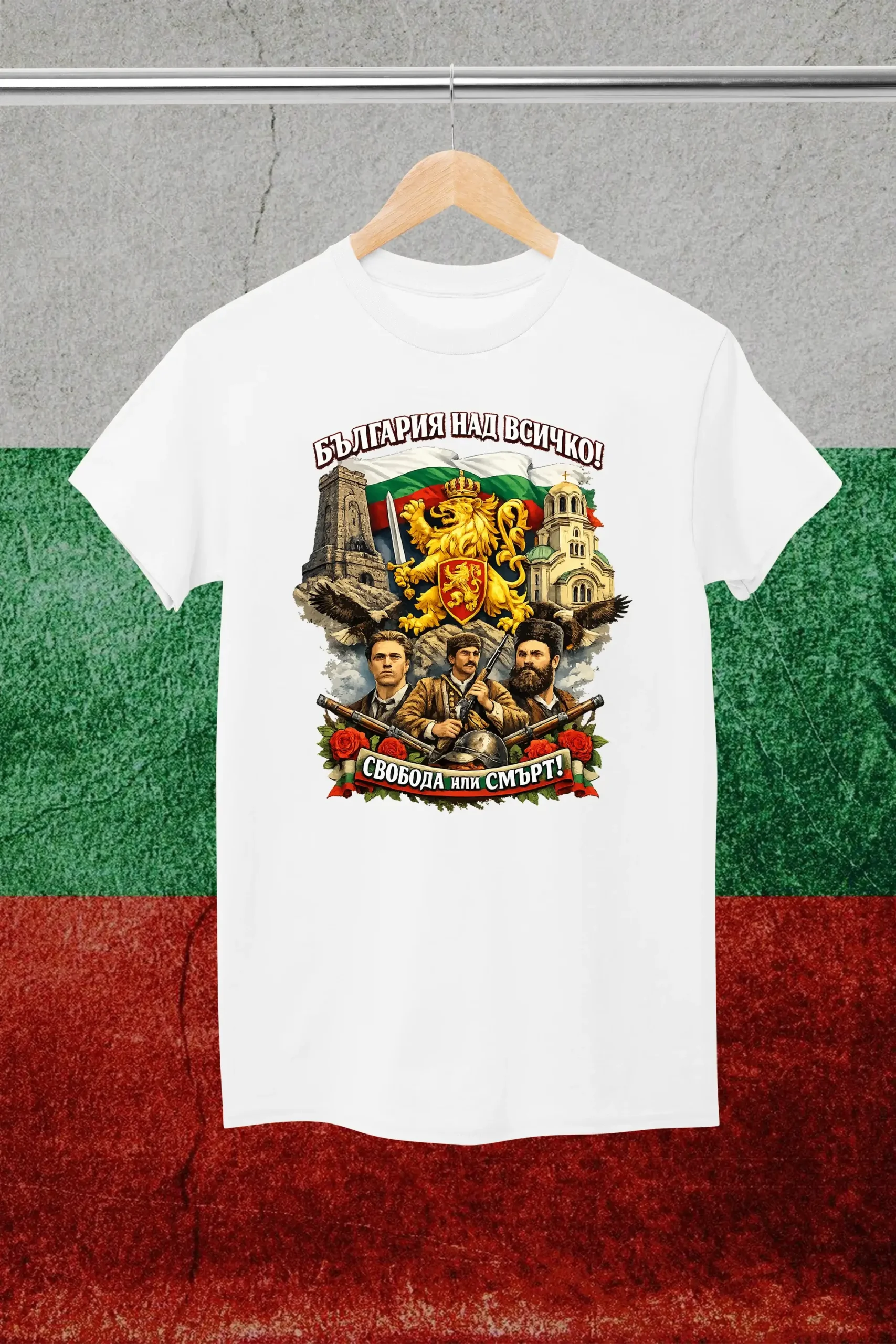 Покажи своята вярност, сила и принадлежност към България с патриотичната тениска „България над всичко“ – внушителен дизайн, който събира в едно националните ни символи, героичния дух и безкомпромисното послание за чест, свобода и родолюбие.