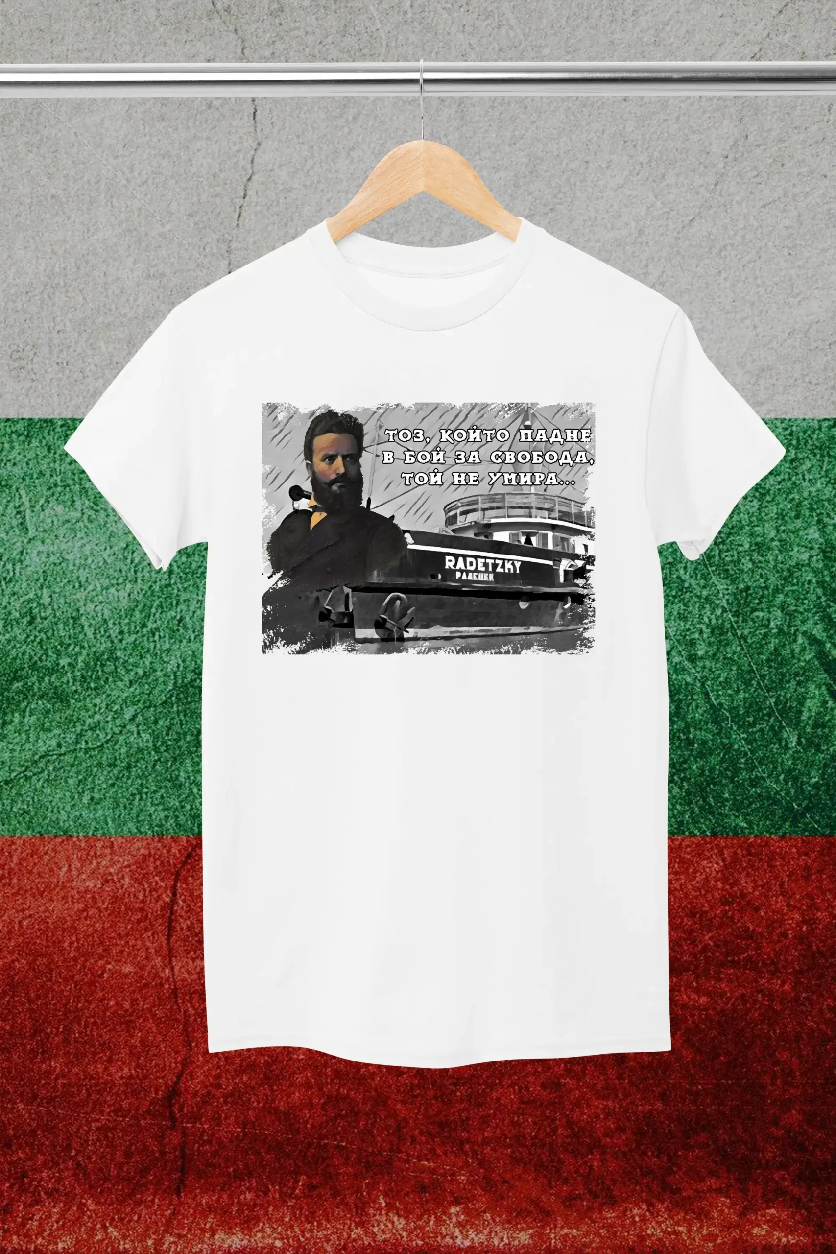 Върху тениската е изобразен детайлен портрет на Христо Ботев – символ на свобода, смелост и национално достойнство. Дизайнът е създаден с внимание към всеки елемент, за да подчертае неговия героизъм и приноса към българската независимост. Това не е просто дреха – това е патриотично послание, облечено в съвременен стил.