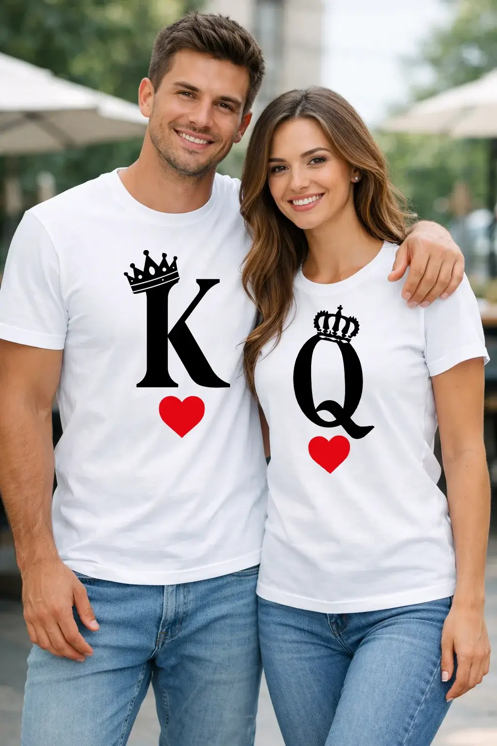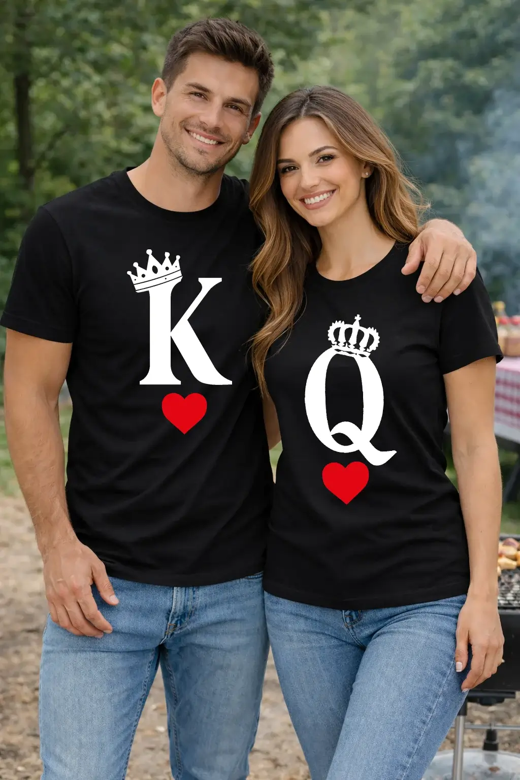 Този комплект тениски за двойки King & Queen – K и Q е създаден, за да покаже специалната връзка между двама души по стилен, модерен и изключително емоционален начин. Дизайнът съчетава класическата символика на картите за игра – K (King) и Q (Queen), украсени с корони и сърца, превръщайки обикновената тениска в послание за любов, вярност и принадлежност.