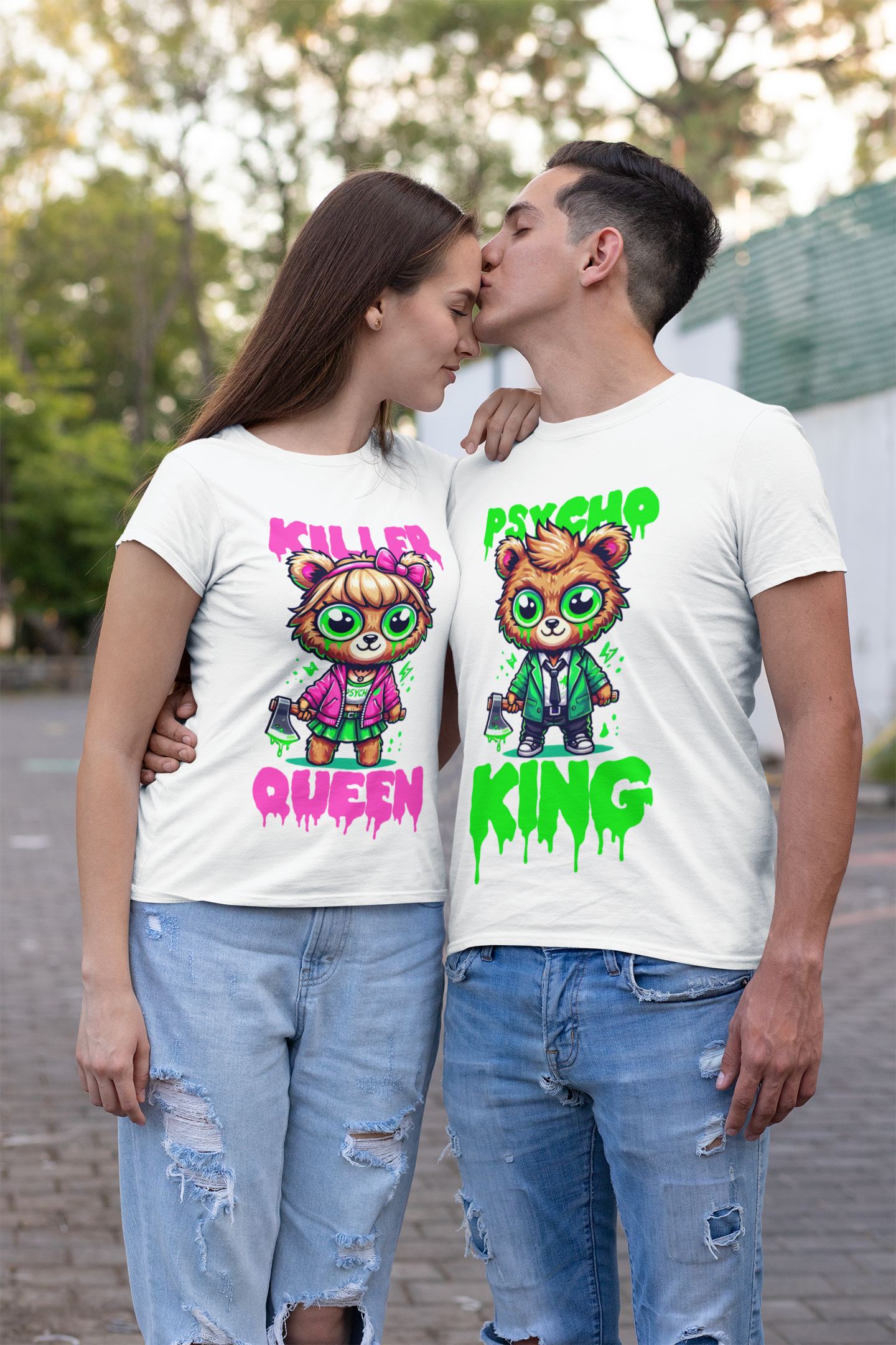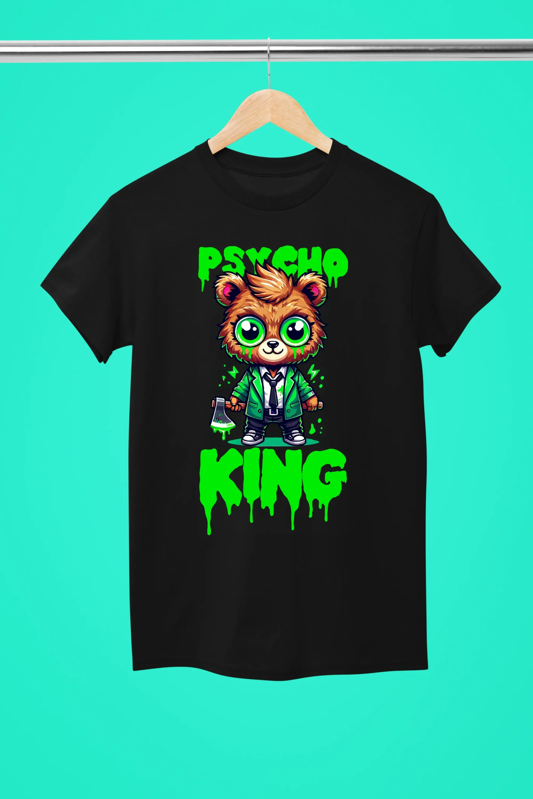 Мъжката тениска представя мъжко мече с лудешка усмивка и силно излъчване. Надписът „Psycho King“ подчертава доминиращия и забавен характер на мъжа, който не се страхува да бъде себе си, дори когато е малко луд по своята „Killer Queen“.