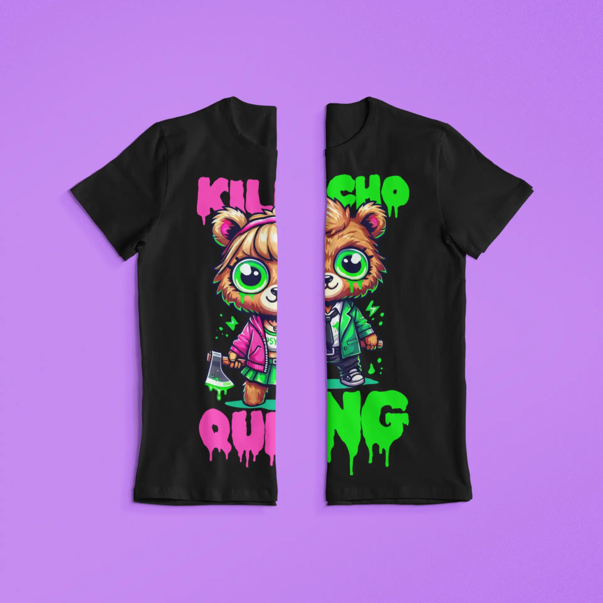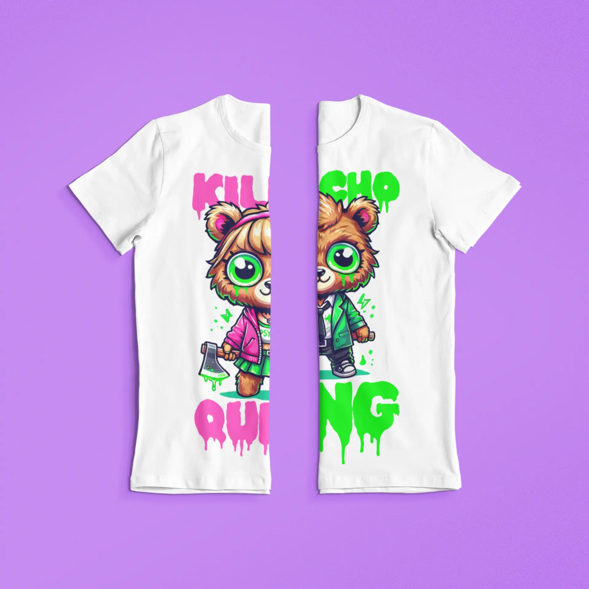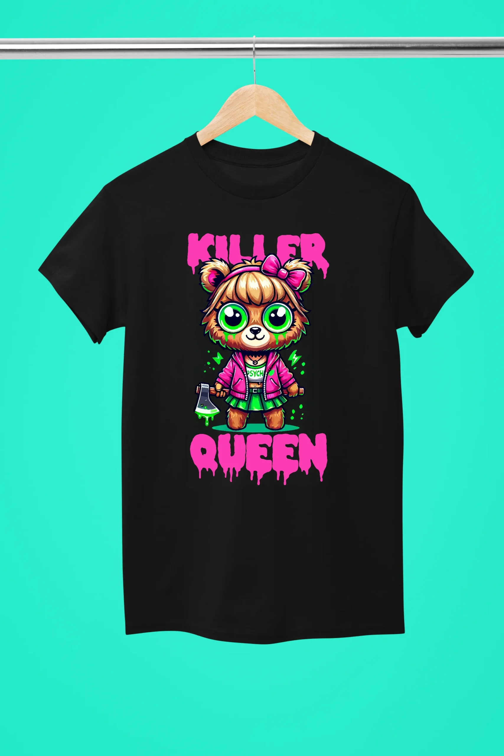 Дамската тениска е със сладко, но опасно мече, което държи нож – символ на дамското очарование, съчетано с игривата заплаха. Надписът „Killer Queen“ показва силата и увереността на жената, която не се страхува да бъде себе си с малко „психо“ характер. Идеална за жени с чувство за хумор и самочувствие.