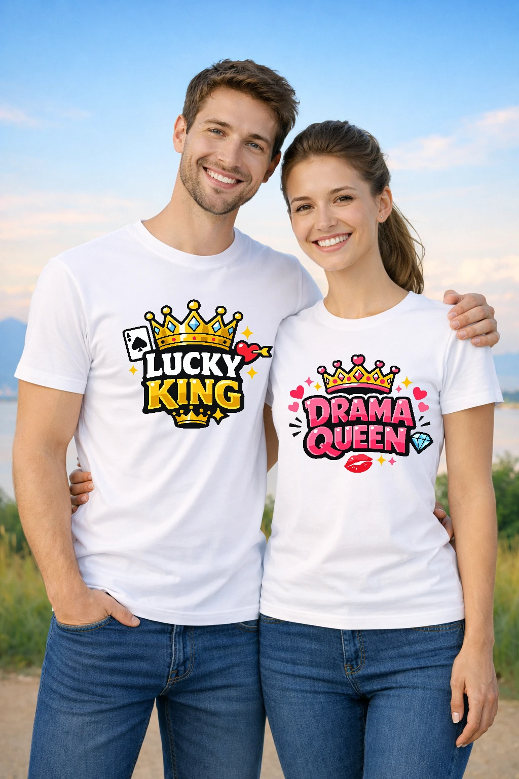 Тениски за двойки Lucky King и Drama Queen са комплект тениски за двойки с атрактивен дизайн – всяка тениска е с голяма корона и забавен надпис. Едната тениска е с надпис Lucky King, декорирана с златна корона, карта и сърце, а другата – с надпис Drama Queen, украсена с розова корона, диамант и сърца. Този комплект е идеален за двойки, които обичат да се забавляват заедно и да показват своята връзка по оригинален начин.
