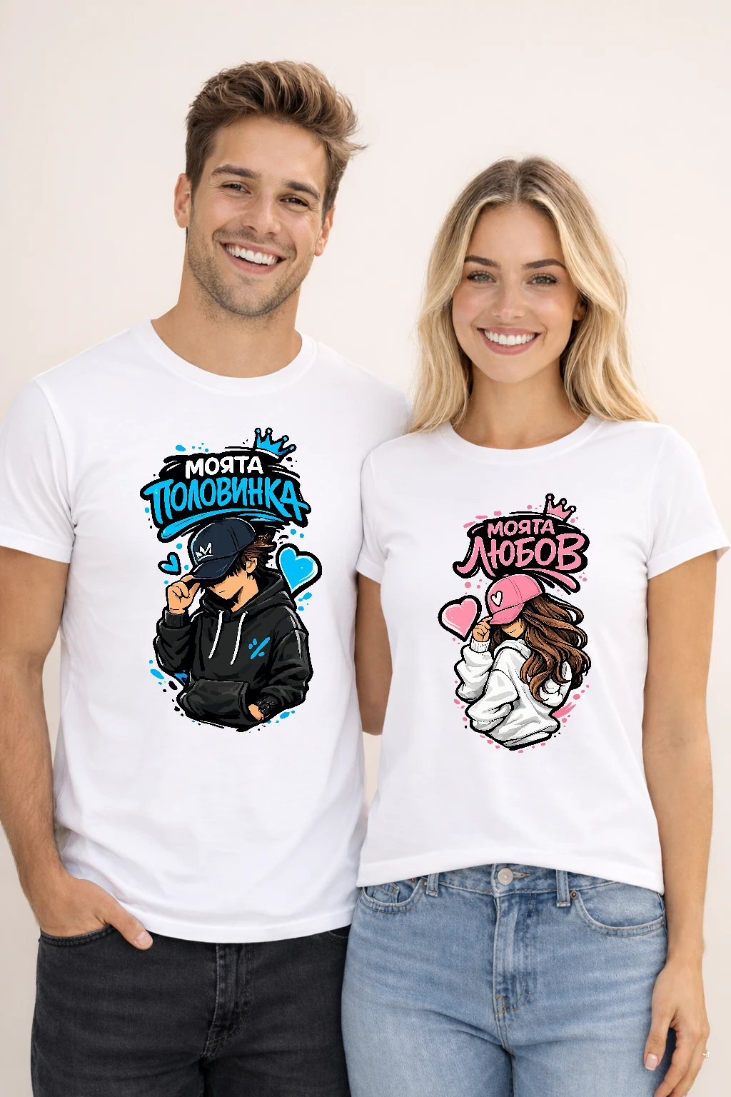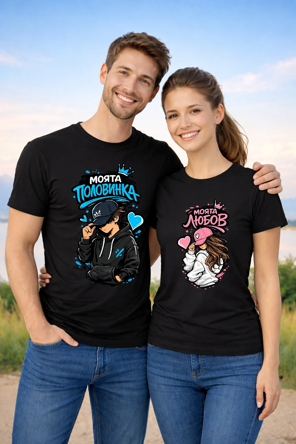 Тениски за двойки с надписи Моята половинка и Моята любов са идеалният избор за всички влюбени, които искат да покажат своята връзка по забавен и оригинален начин. Дизайнът включва стилни илюстрации на момче и момиче с шапки, всяка тениска с различен надпис – „Моята половинка“ за него и „Моята любов“ за нея, допълнени от цветни сърца и коронки.
