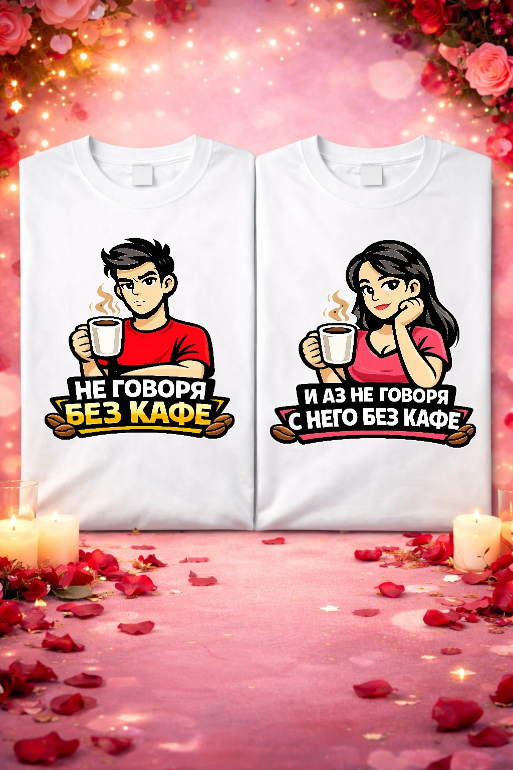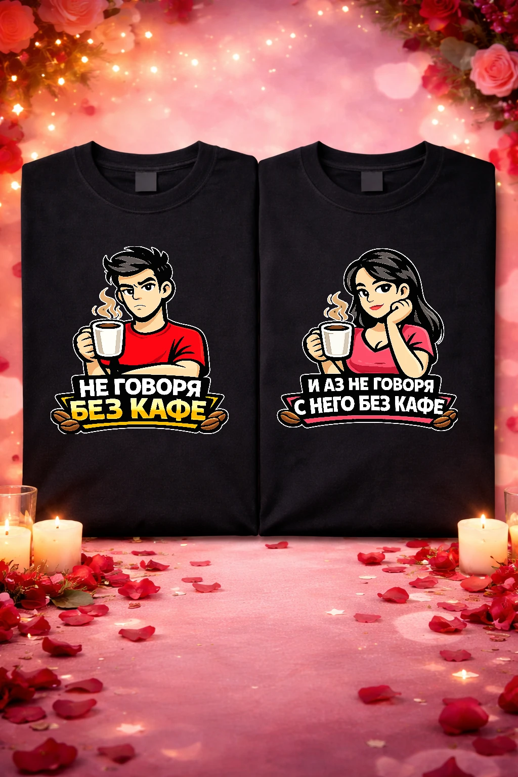 Забавни тениски за двойки с кафе мотив са чудесен избор за всички, които обичат да започват деня си с ароматна чаша кафе и споделен хумор. Дизайнът включва две тениски – едната с илюстрация на момче, държащо чаша кафе и надпис „Не говоря без кафе“, а другата с момиче и надпис „И аз не говоря с него без кафе“. Този комплект е идеален за двойки, които ценят забавните моменти и споделените ритуали.