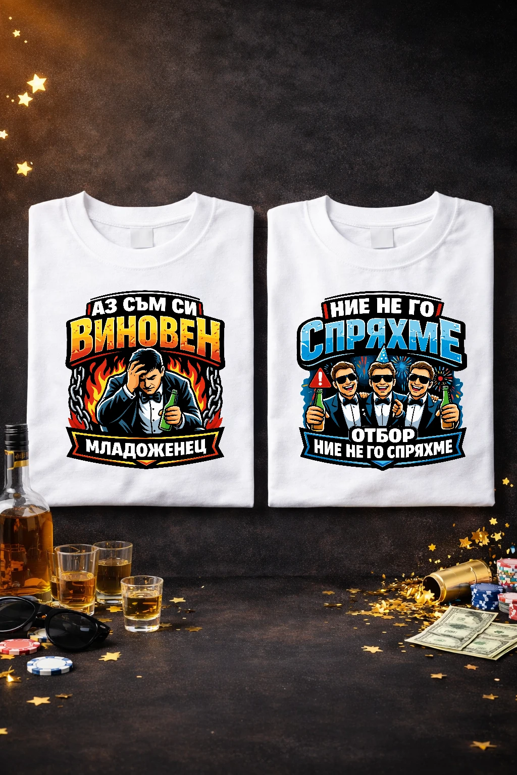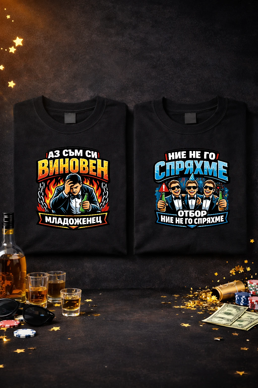 Тениски за ергенско парти Аз съм си виновен и Ние не го спряхме са перфектният избор за всяко мъжко събиране преди сватбата. Дизайнът включва две различни тениски – едната с надпис „Аз съм си виновен“ и илюстрация на младоженец с бутилка, а другата с надпис „Ние не го спряхме“ и забавна илюстрация на приятелската група с парти аксесоари. Ярките цветове и комичните образи създават настроение и подчертават духа на ергенското парти.