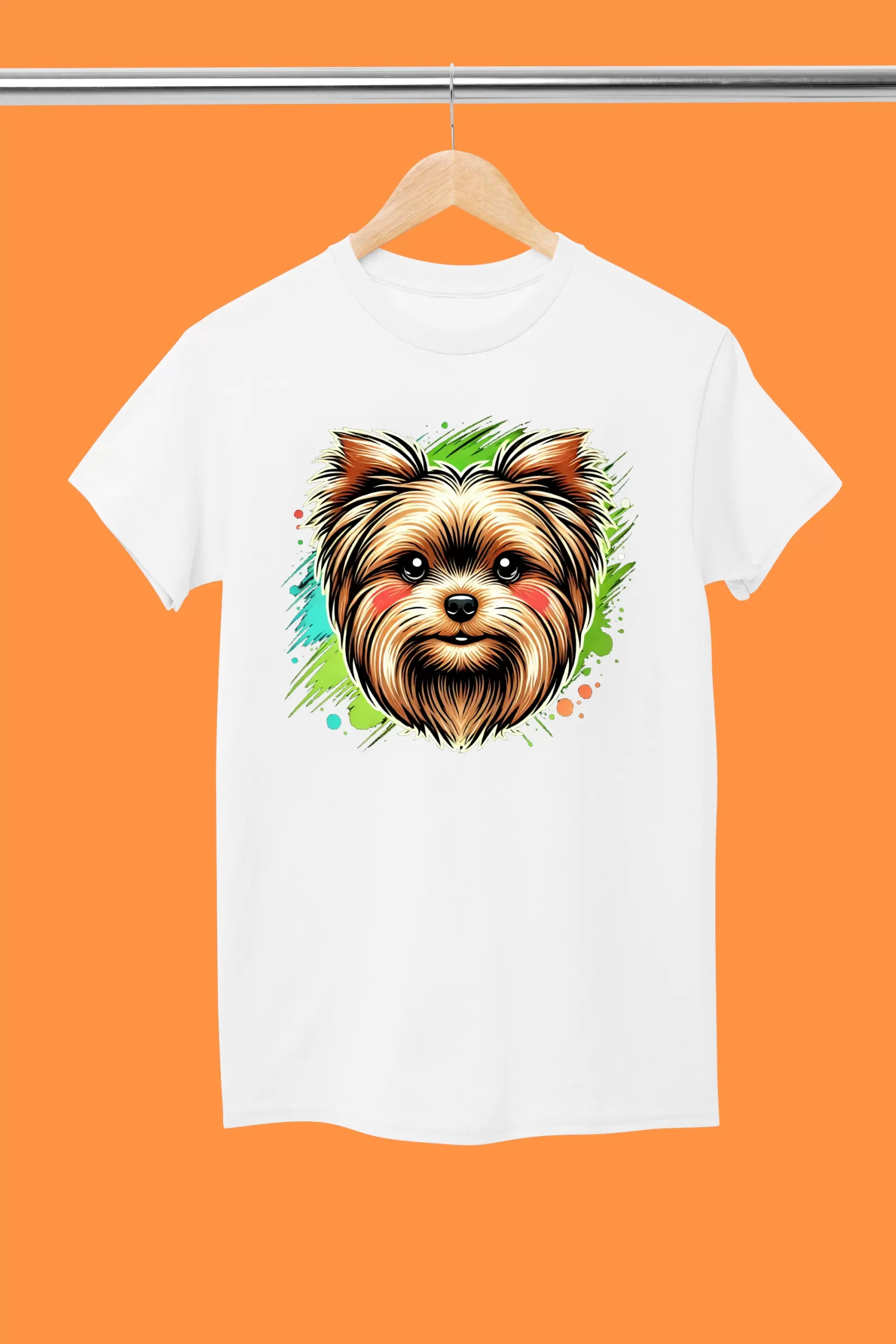 На предната част на тениската е поставен уникален арт дизайн, вдъхновен от жизнерадостната и енергична същност на малките породи кучета. Творческият подход в изображението улавя както динамиката, така и очарованието на Йоркширския териер. Детайлите в дизайна създават чувство за движение и игривост, което прави тениската идеална за хора, търсещи нещо забавно и различно.