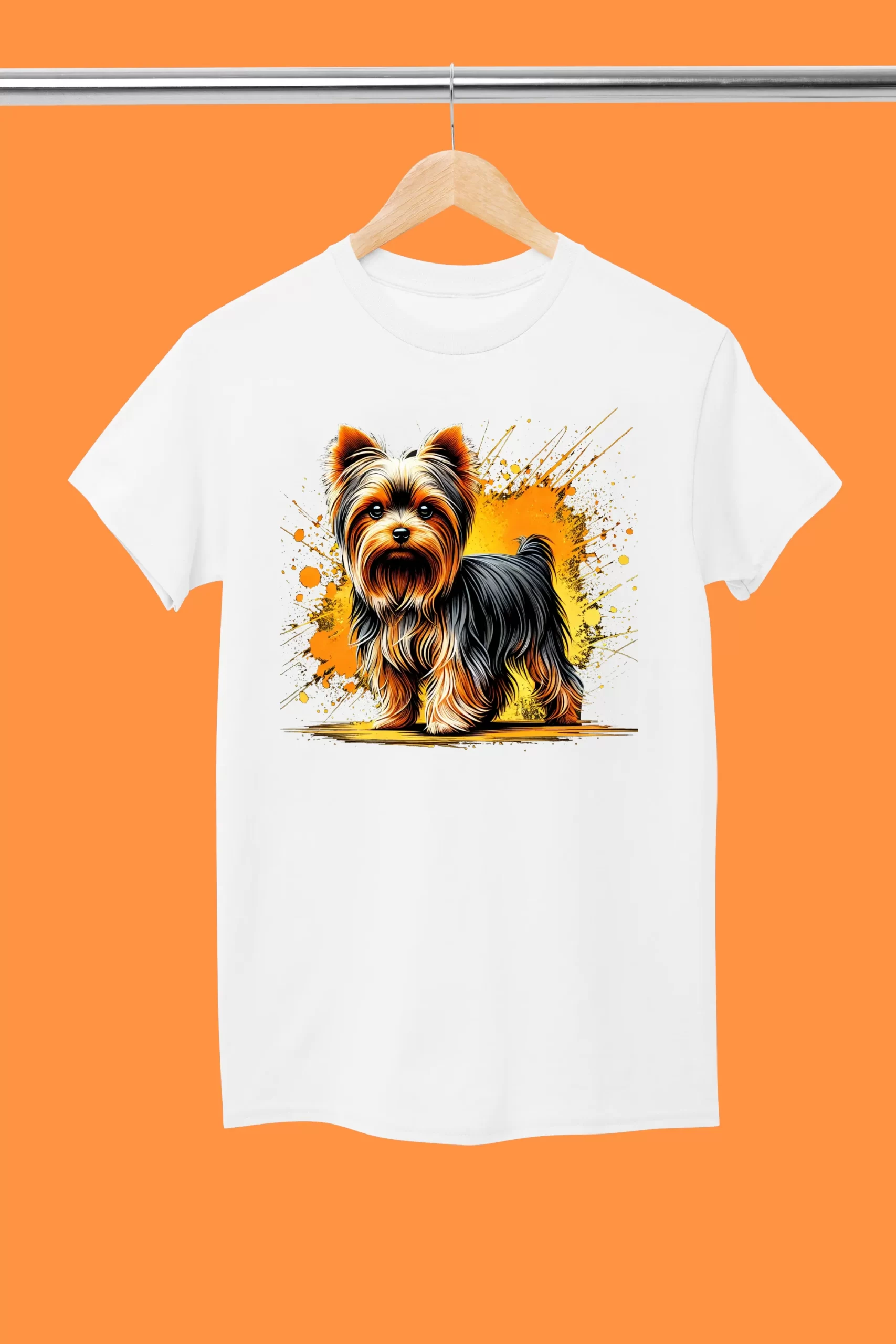 На предната част на тениската е поставен уникален арт дизайн, вдъхновен от жизнерадостната и енергична същност на малките породи кучета. Творческият подход в изображението улавя както динамиката, така и очарованието на Йоркширския териер. Детайлите в дизайна създават чувство за движение и игривост, което прави тениската идеална за хора, търсещи нещо забавно и различно.